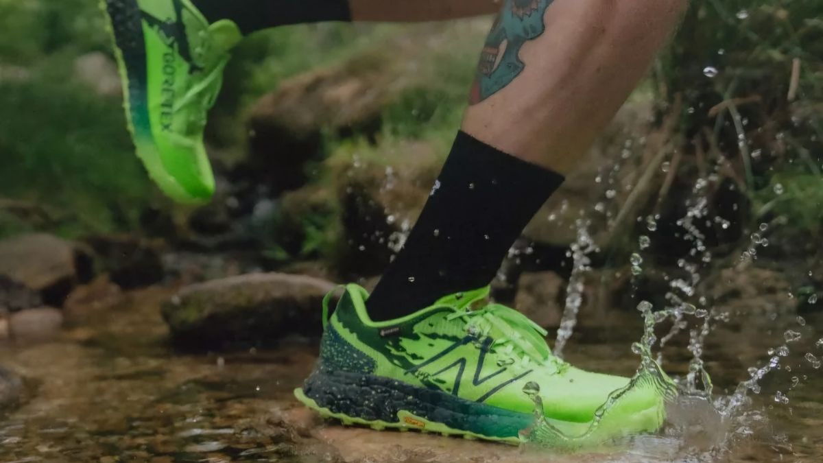 New Balance Fresh Foam Hierro v7 GTX mencampurkan sol tengah Fresh Foam yang lembut bersama lapisan GORE-TEX tahan air.