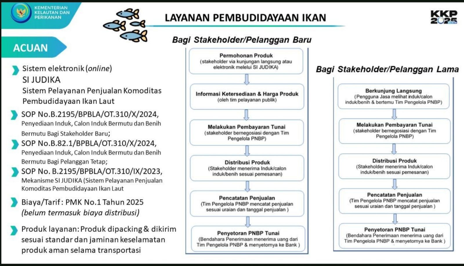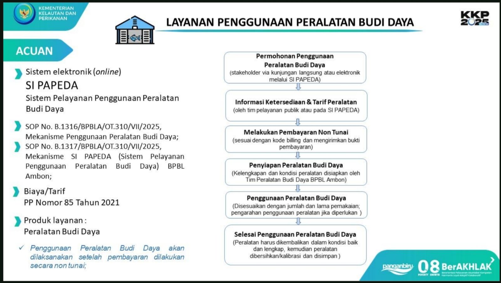 Menurut Sarwono, BPBL Ambon saat ini dalam penyelenggaraan pelayanan public berpedoman pada Keputusan Menteri Kelautan dan Perikanan terbaru nomor 20 tahun 2025 dimana terdapat tambahan satu layanan public menjadi 4 layanan public.