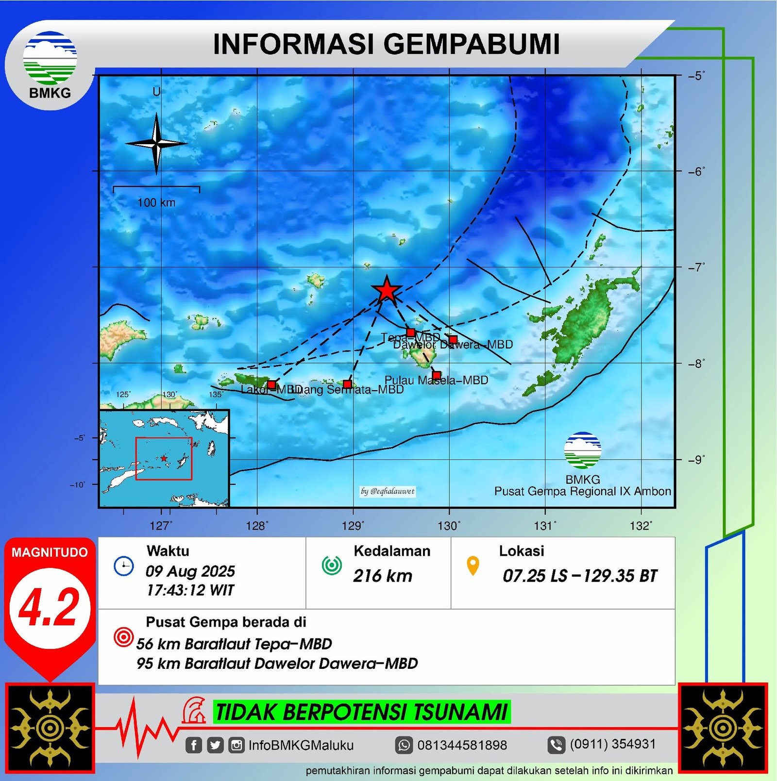MALUKU BARAT DAYA – Bumi Maluku Barat Daya kembali bergetar. Sabtu sore, 9 Agustus 2025 pukul 17.43 WIT, Badan Meteorologi, Klimatologi, dan Geofisika (BMKG) melaporkan gempa berkekuatan Magnitudo 4,2 mengguncang dari kedalaman 216 kilometer. Episentrum gempa terletak di koordinat 7,25 Lintang Selatan dan 129,35 Bujur Timur, sekitar 56 kilometer barat laut Tepa serta 95 kilometer barat laut Dawelor Dawera, wilayah Kabupaten MBD.