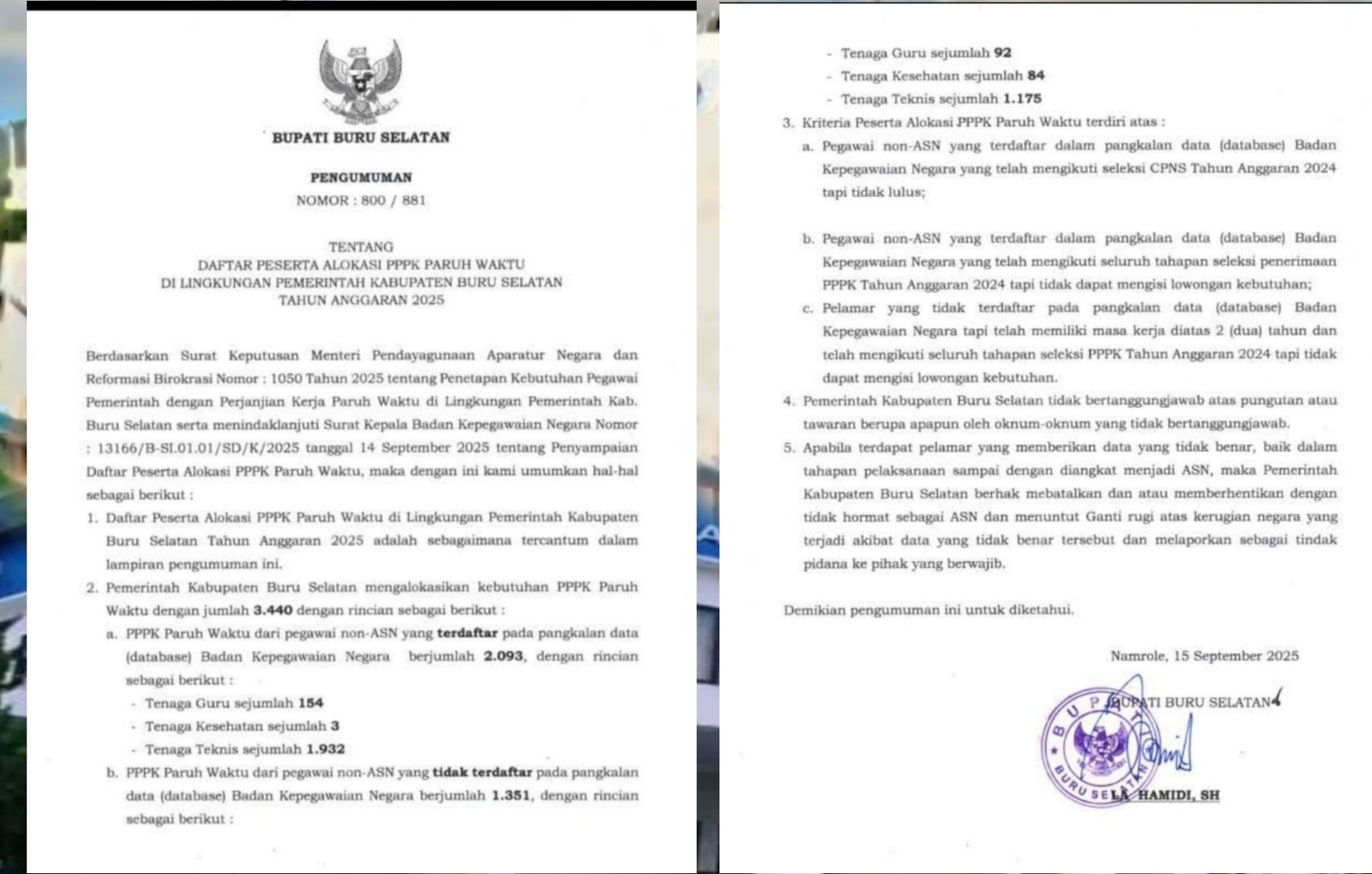 Pengumuman ini menjadi jawaban atas kerinduan banyak tenaga honorer yang selama ini mengabdi di pelosok Buru Selatan. Di antara derap langkah waktu, kabar ini hadir sebagai secercah harapan—bahwa pengabdian mereka tak sekadar terhitung tahun, melainkan kini diakui negara.