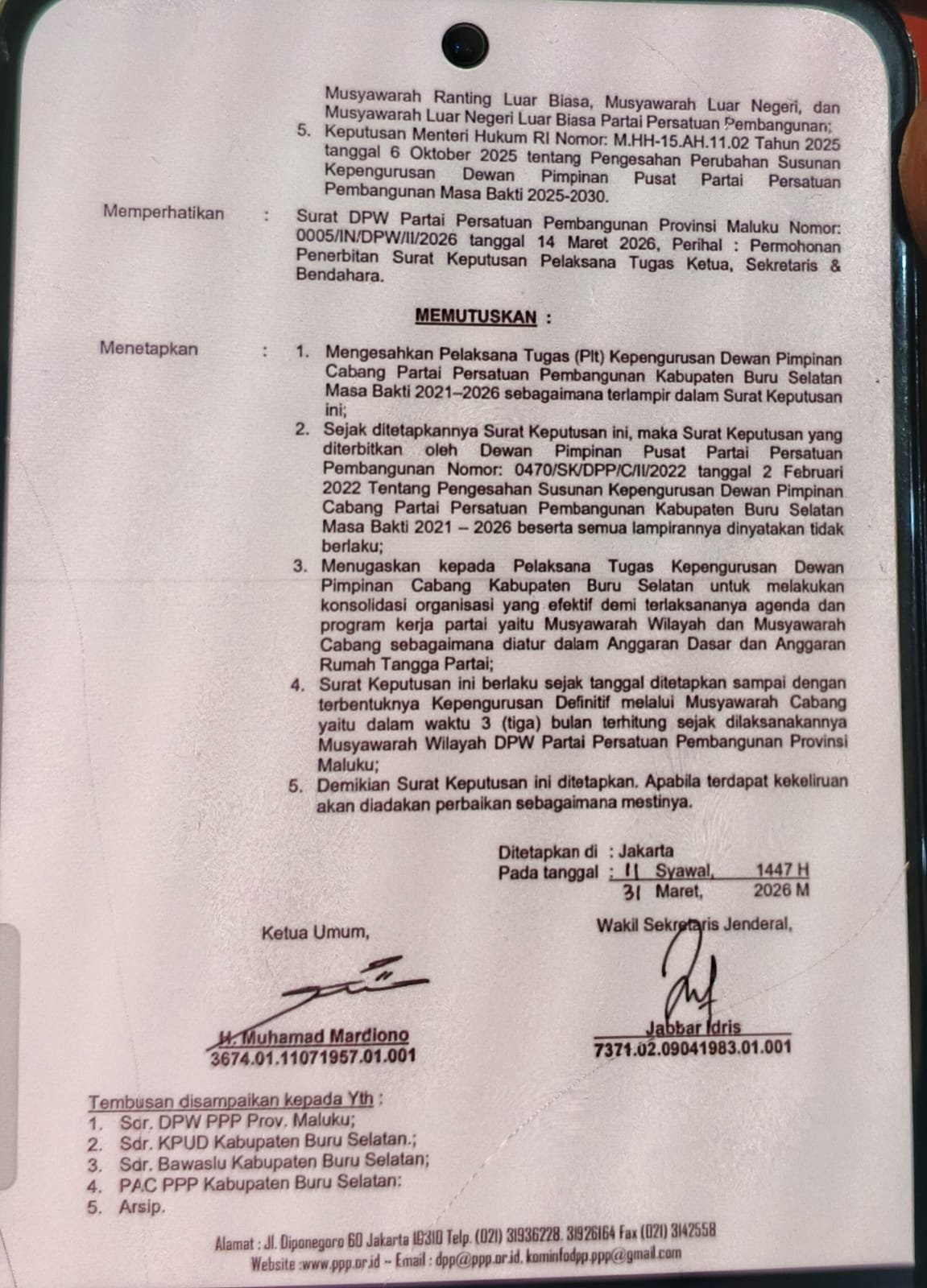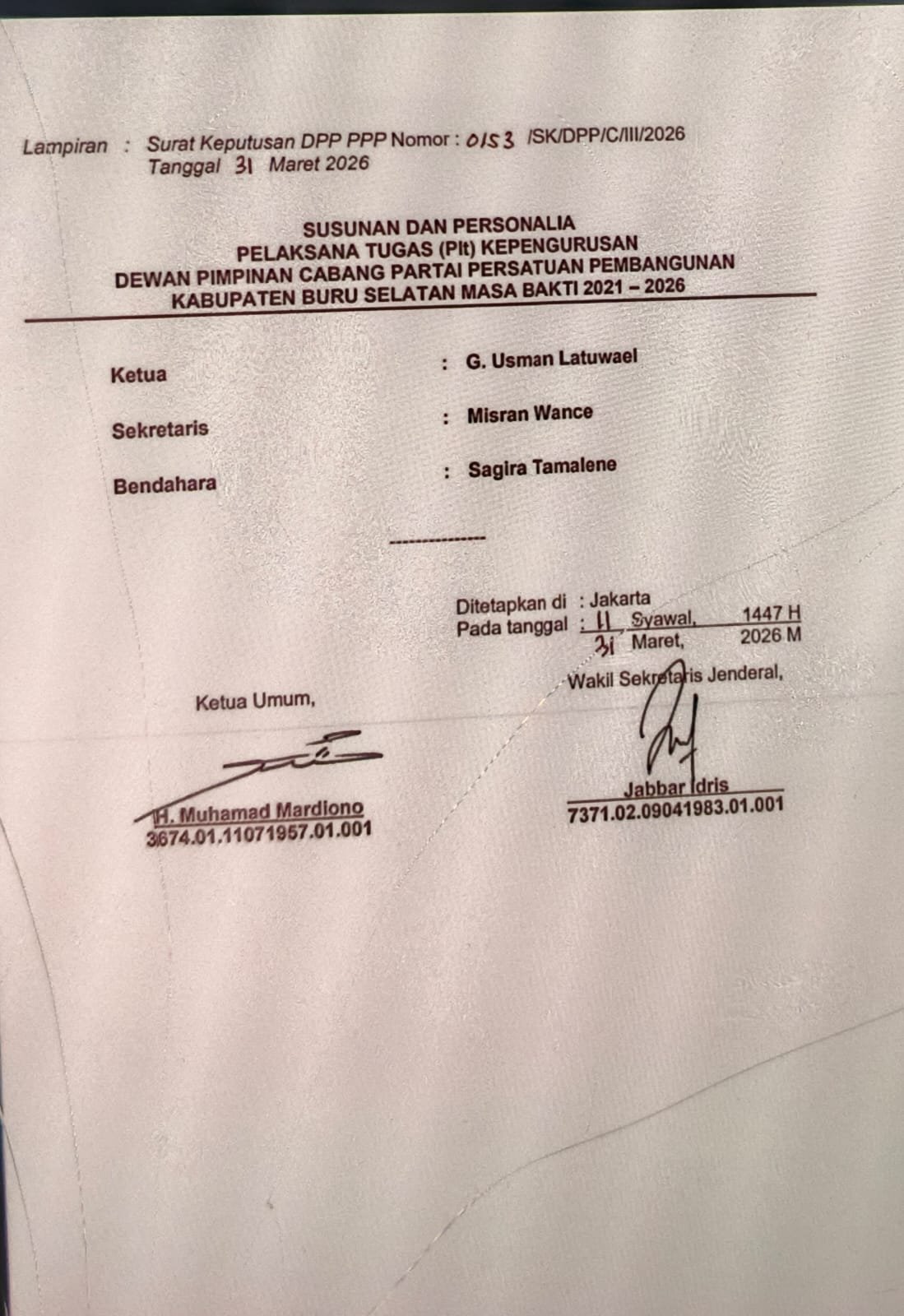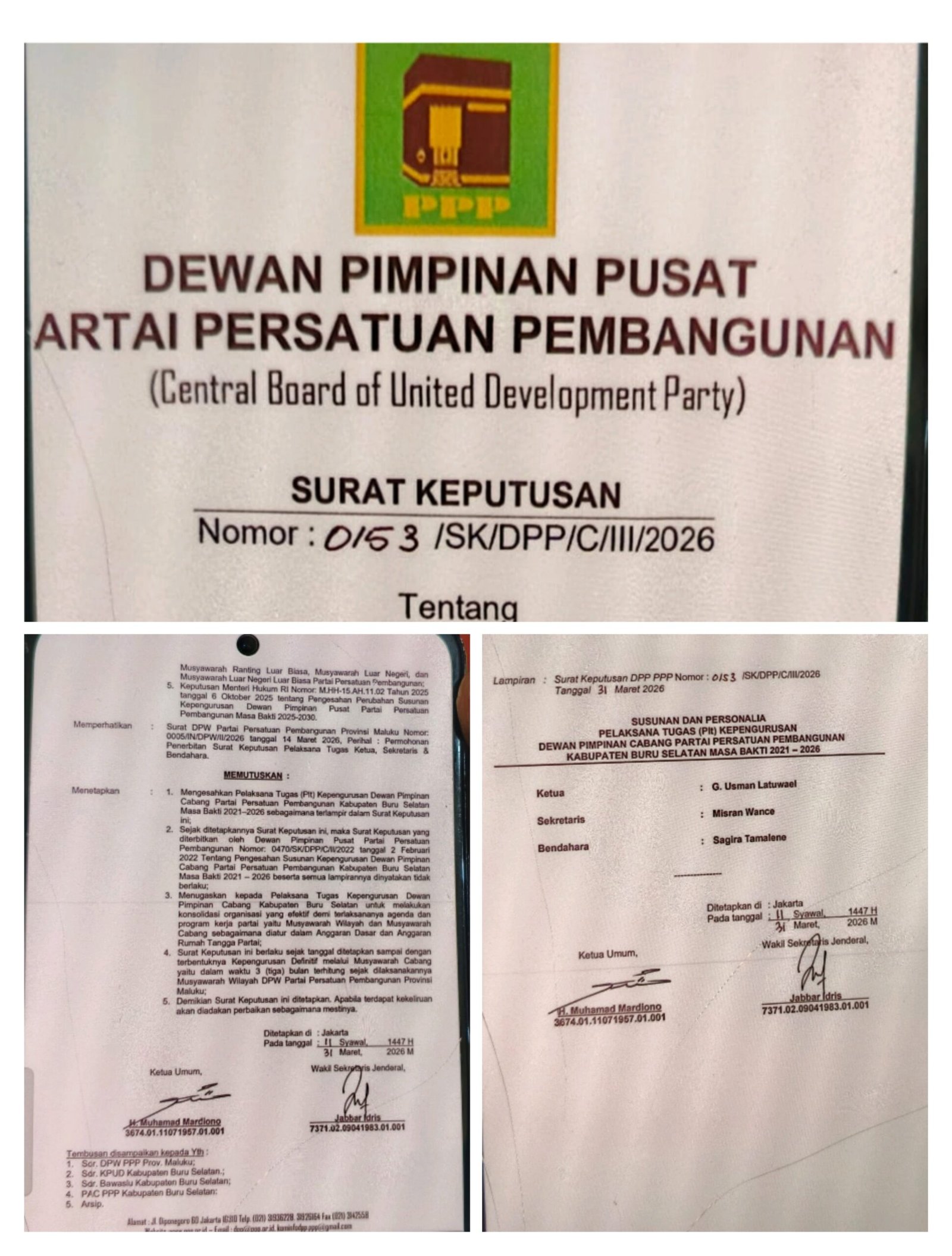 Surat keputusan yang ditandatangani Ketua Umum Muhamad Mardiono bersama Wakil Sekretaris Jenderal Jabbar Idris pada 31 Maret 2026 di Jakarta itu menunjuk G. Usman Latuwael sebagai Ketua Plt. Ia didampingi Misran Wance sebagai Sekretaris dan Sagita Tamalene sebagai Bendahara.