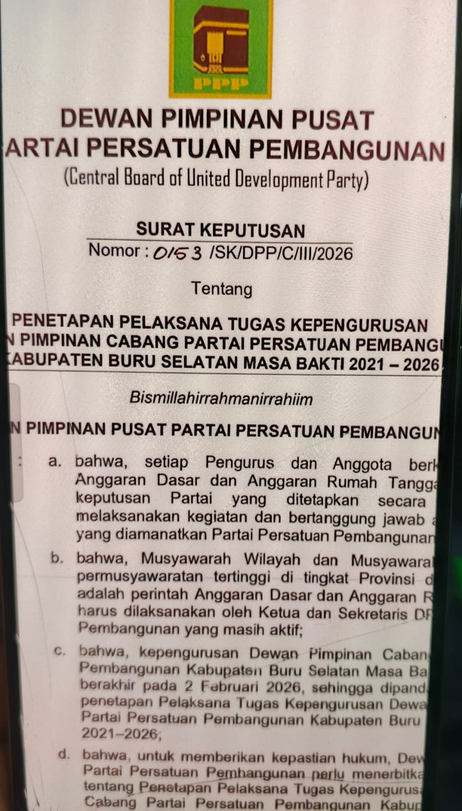 Bursel, Ambontoday.com – Dewan Pimpinan Pusat Partai Persatuan Pembangunan resmi mengeluarkan keputusan strategis terkait kepengurusan di Kabupaten Buru Selatan. Melalui Surat Keputusan Nomor 0153/SK/DPP/C/III/2026, DPP menetapkan pelaksana tugas (Plt) kepengurusan Dewan Pimpinan Cabang (DPC) untuk masa bakti 2021–2026.