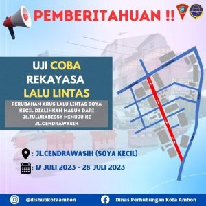 Dirinya berharap, masyarakat kota Ambon dapat menyesuaikan dengan proses uji coba rekayasa lalu lintas yang akan berlangsung selama 10 (sepuluh) hari kerja yakni 17 – 28 Juli 2023.