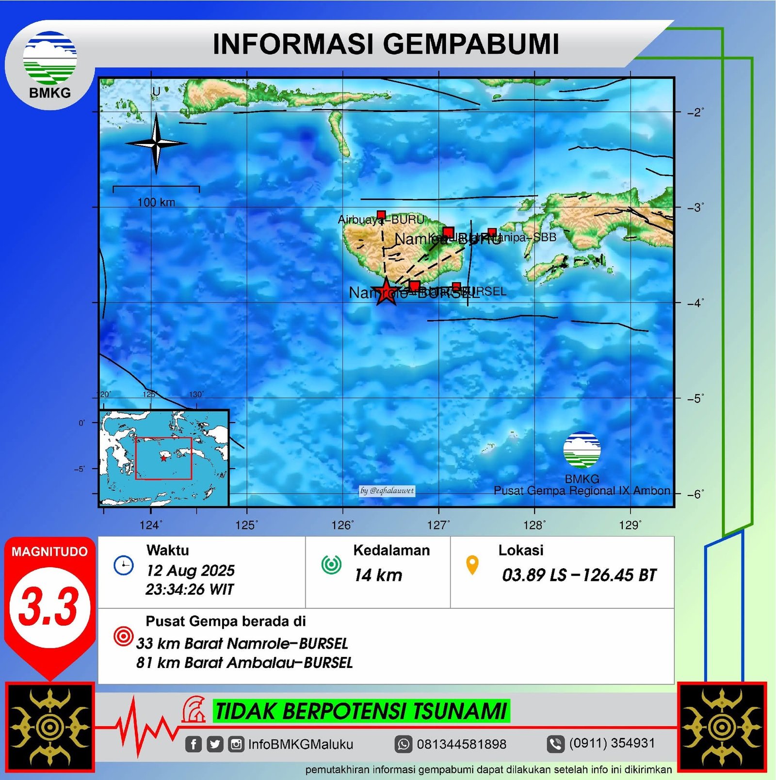 Badan Meteorologi, Klimatologi, dan Geofisika (BMKG) PGR IX mencatat, gempa dengan magnitudo 3,3 terjadi pada Selasa malam, pukul 23:34:26 WIT. Episentrumnya berada di 03,89 Lintang Selatan dan 126,45 Bujur Timur, sekitar 33 kilometer di barat Namrole dan 81 kilometer di barat Ambalau, Kabupaten Buru Selatan. Gempa itu berdiam di kedalaman 14 kilometer, bagai bisikan yang keluar dari rahim bumi.