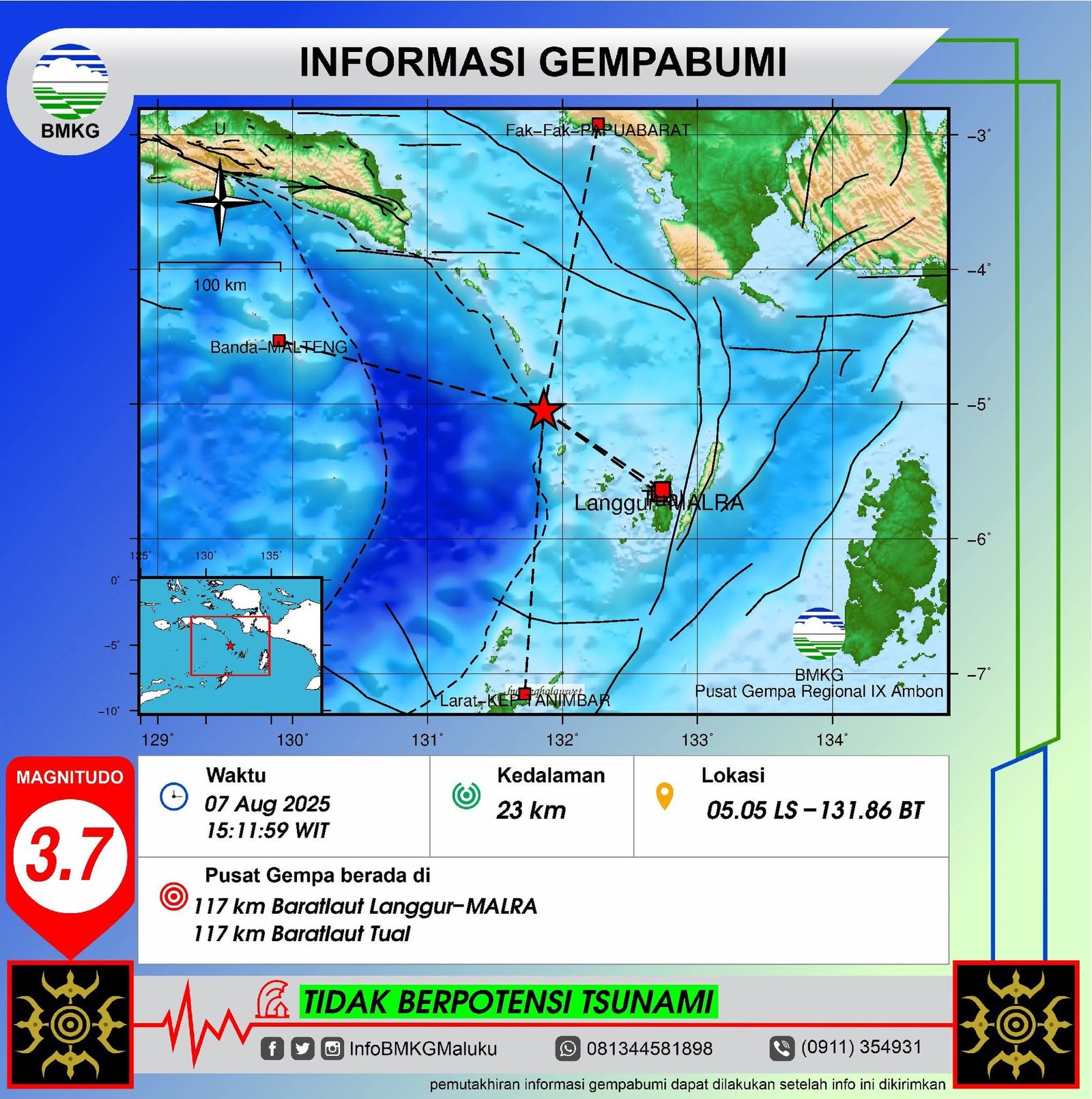 AmbinToday.Com – 7 Agustus 2025 — Langit sore di Timur Indonesia mendadak menyampaikan kabar dari perut bumi. Gempa berkekuatan 3,7 magnitudo mengguncang kawasan 117 kilometer barat laut Langgur, Maluku Tenggara, dan Tual, pada pukul 15:11:59 WIT, sebagaimana dilaporkan oleh Badan Meteorologi Klimatologi dan Geofisika (BMKG) Wilayah IX.