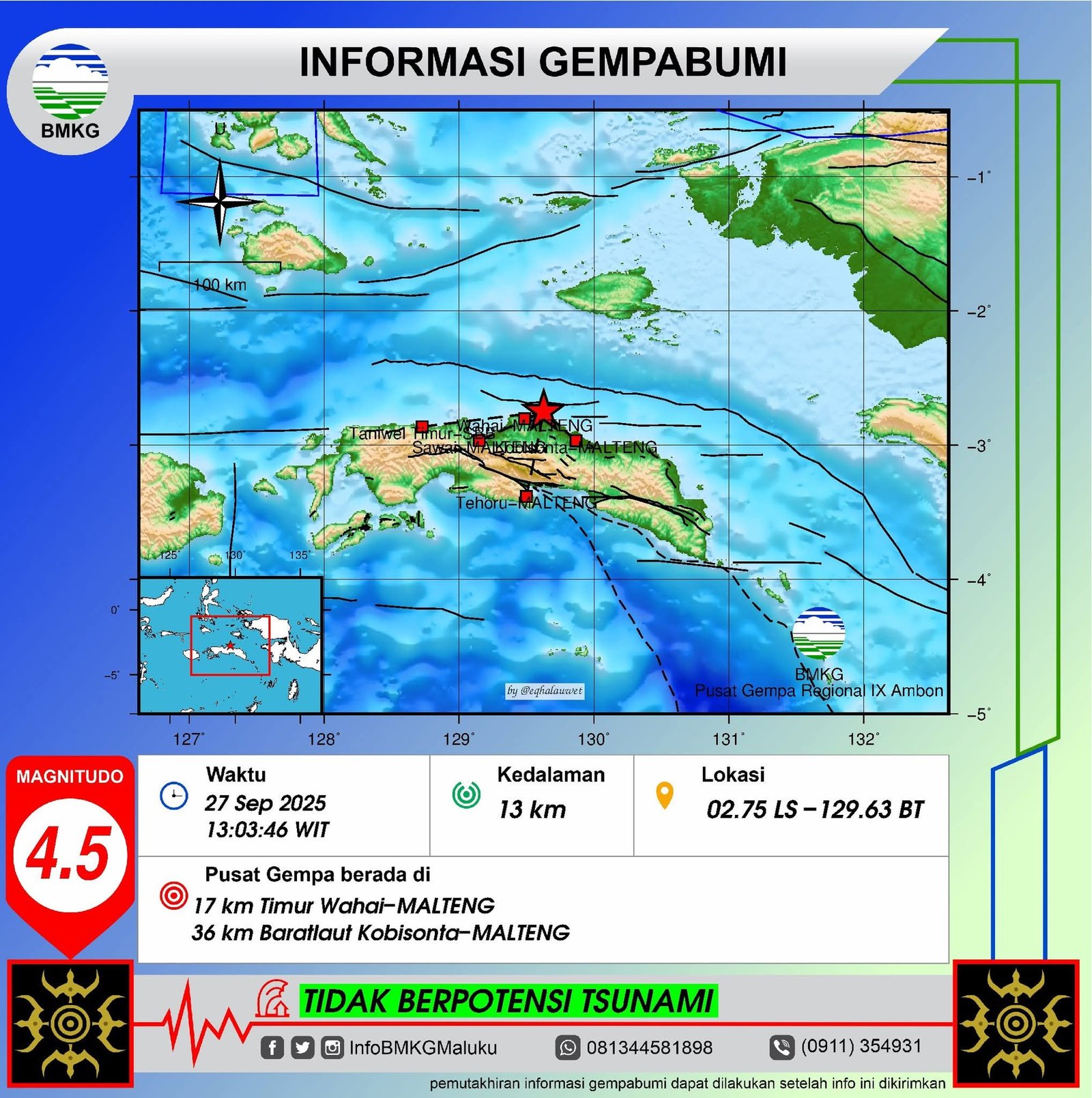 Maluku Tengah – Bumi Seram kembali bergetar. Sabtu siang (27/9/2025) pukul 13.03 WIT, Badan Meteorologi, Klimatologi, dan Geofisika (BMKG) mencatat gempa dengan magnitudo 4,5 mengguncang wilayah Wahai, Maluku Tengah.