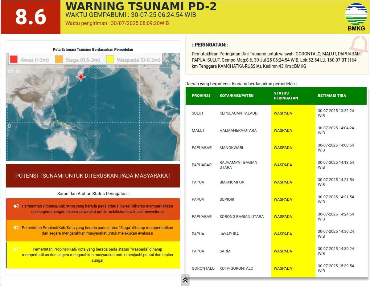 Sementara itu, hasil pemodelan dan analisis dari BMKG menyatakan bahwa wilayah Indonesia juga berpotensi terdampak. Status WASPADA dikeluarkan untuk beberapa wilayah pesisir dengan estimasi ketinggian gelombang tsunami kurang dari 0,5 meter, yang tetap harus diwaspadai dengan serius.