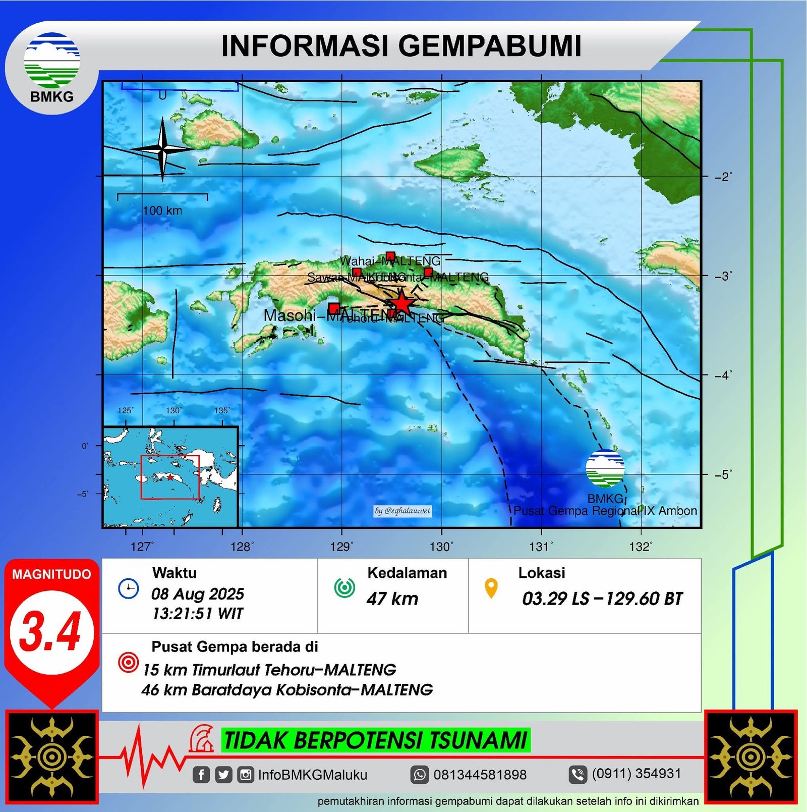 Jumat, 8 Agustus 2025, pukul 13.21 WIT, gempa bermagnitudo 3,4 mengguncang timur laut Tehoru, Maluku Tengah. BMKG mencatat pusat gempa berada di kedalaman 47 kilometer, berjarak sekitar 15 kilometer dari Tehoru dan 46 kilometer barat daya Kobisonta. Meski tak menimbulkan kerusakan, getarannya adalah pengingat bahwa tanah ini tak pernah benar-benar diam.