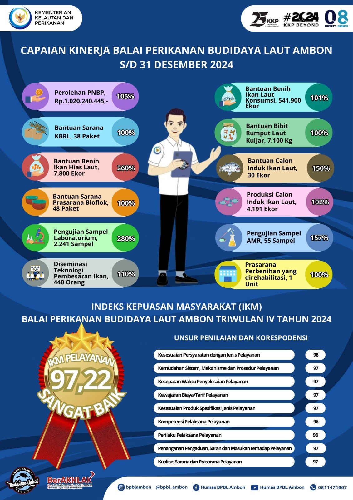 Sementara Indeks Kepuasan Masyarakat (IKM), Selain capaian kinerja, tingkat kepuasan masyarakat terhadap layanan BPBL Ambon juga menjadi indikator keberhasilan. Pada Triwulan IV Tahun 2024, BPBL Ambon berhasil meraih Indeks Kepuasan Masyarakat (IKM) dengan skor 97,22, Predikan Sangat Baik .
