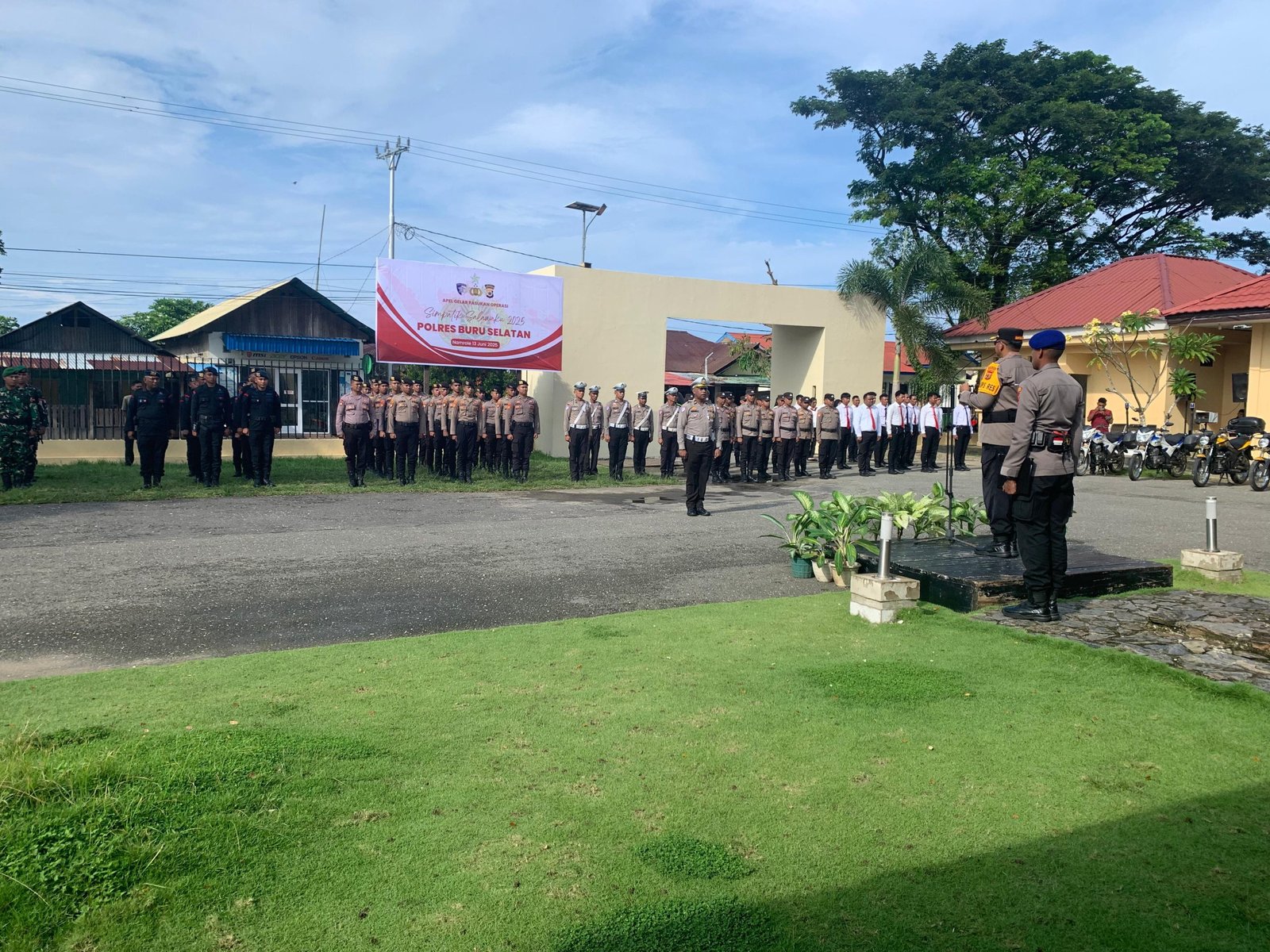 Dalam Apel Gelar Pasukan Operasi Simpatik Salawaku 2025 yang dilakukan oleh Polres Buru Selatan di Ikuti oleh Waka Polres Buru Selatan Kompol Syarifuddin, S.Sos, Danki Kompi C Yonif 735 Nawasena, Letda Dafit B Raja Guguk, Danton 1 Kompi 3 Batalion A Pelopor Ipda M. Kadafi Bin Talib, S.Sos, Para pejabat Utama Polres Buru Selatan, (PJU), 1 Platon Kompi C Yonif 735 Nawasena, 1 Platon Kompi 3 Batalion A Pelopor,1 Platon Sat Samapta,1 Platon Lantas, 1 Platon Gabungan Staf dan 1 Platon Gabungan Sat,Reskrim,Narkoba dan Sat Intelkam.