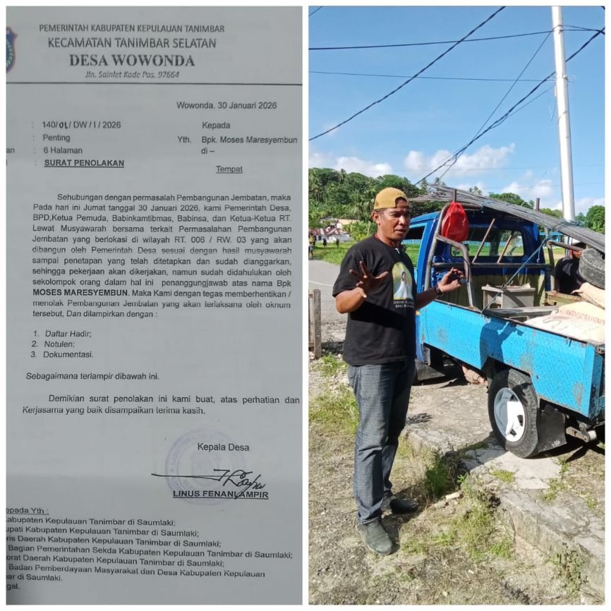 Saumlaki, Ambontoday.com – Sebuah surat penolakan berkop Pemerintah Desa Wowonda mendadak menggelegar di tengah masyarakat. Isinya tegas, bernada perintah, dan berujung pada satu keputusan keras: menghentikan pembangunan jembatan di RT 006/RW 03. Namun di balik lembaran resmi itu, tersimpan bantahan keras dari warga terutama dari nama yang dijadikan sasaran utama: Moses Maresyembun.