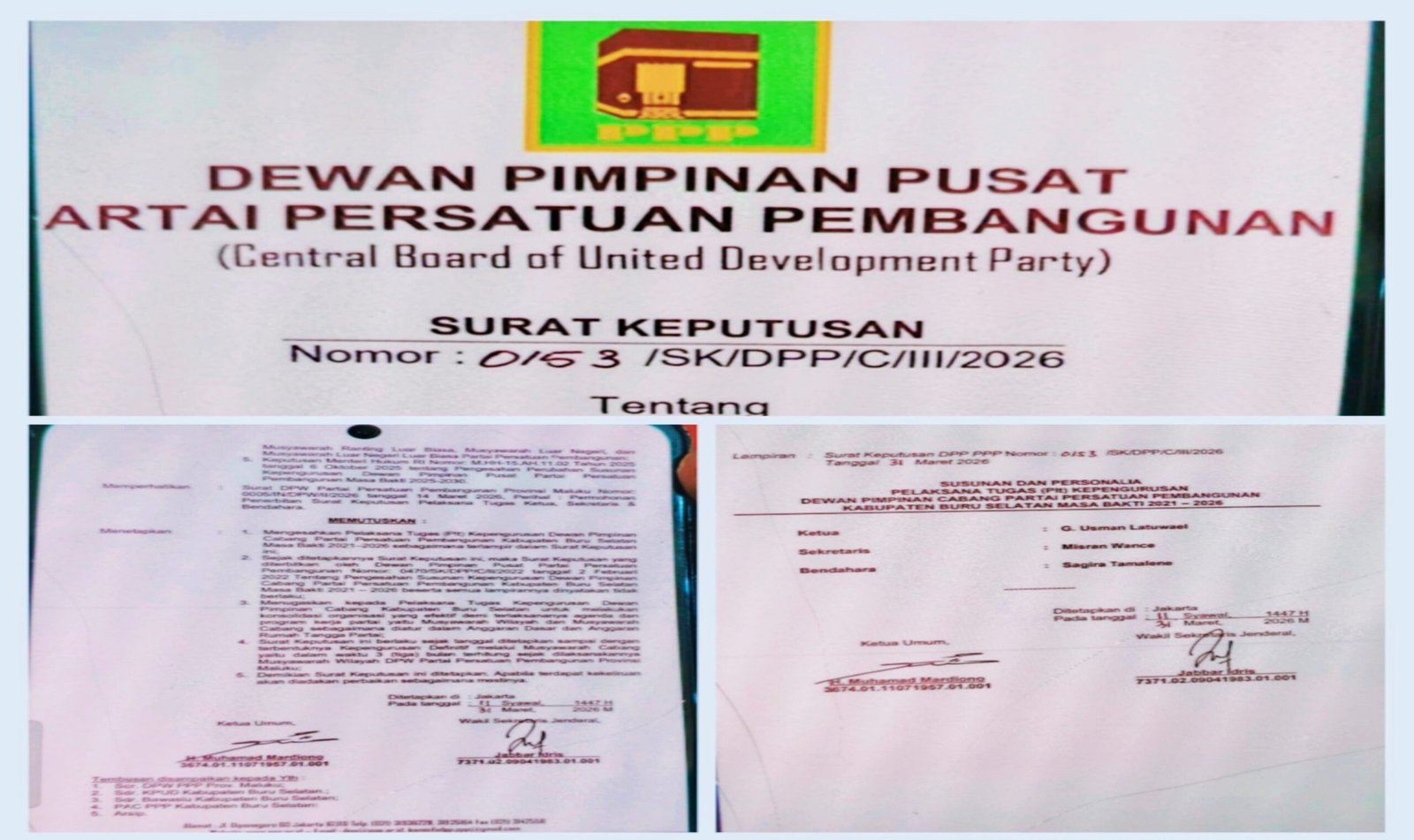 Sebelumnya, DPP PPP resmi menunjuk G. Usman Latuwael sebagai Ketua Plt DPC Kabupaten Buru Selatan, didampingi Misran Wance sebagai Sekretaris dan Sagita Tamalene sebagai Bendahara. Keputusan itu ditandatangani Ketua Umum Muhamad Mardiono bersama Wakil Sekretaris Jenderal Jabbar Idris pada 31 Maret 2026 di Jakarta.