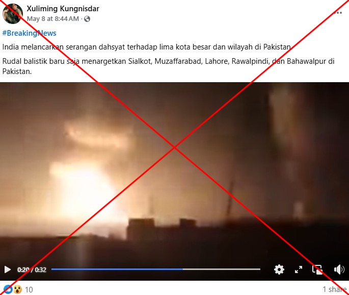 Video yang menggambarkan sejumlah ledakan di suatu lokasi viral di media sosial bersama dengan pernyataan palsu bahwa isi videonya adalah serangan dari India ke Pakistan. Namun, fakta sebenarnya yaitu rekaman tersebut sudah tersebar luas merupakan bagian dari insiden serangan udara Israel di Jalur Gaza pada Oktober 2023 lalu, dan hal itu sama sekali tidak berkaitan dengan perselisihan antara India dan Pakistan yang tengah berlangsung.