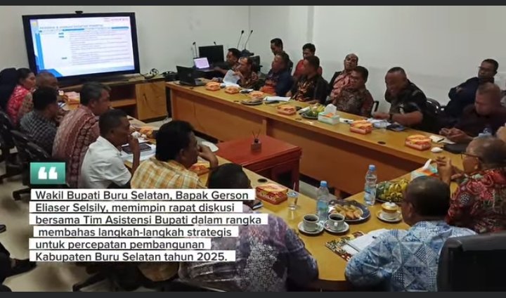 AmbonToday.Com – Namrole, Buru Selatan — Pemerintah Kabupaten Buru Selatan terus memacu langkah dalam mewujudkan visi pembangunan yang progresif dan merata. Pada hari ini, Wakil Bupati Buru Selatan, Gerson Eliaser Selsily, memimpin langsung rapat diskusi percepatan pembangunan tahun 2025 bersama Tim Asistensi Bupati dan seluruh pimpinan Organisasi Perangkat Daerah (OPD).