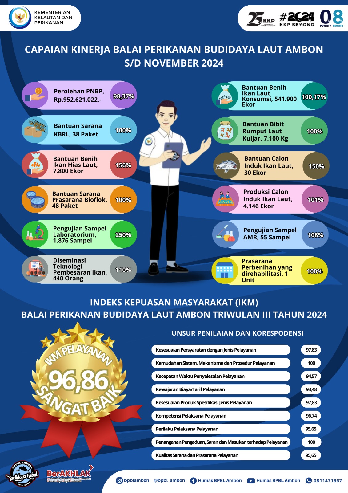 Berdasarkan Survei Kepuasan Masyarakat pada Triwulan III Tahun 2024, BPBL Ambon memperoleh Nilai IKM sebesar 96,86 dengan Predikat SANGAT BAIK.